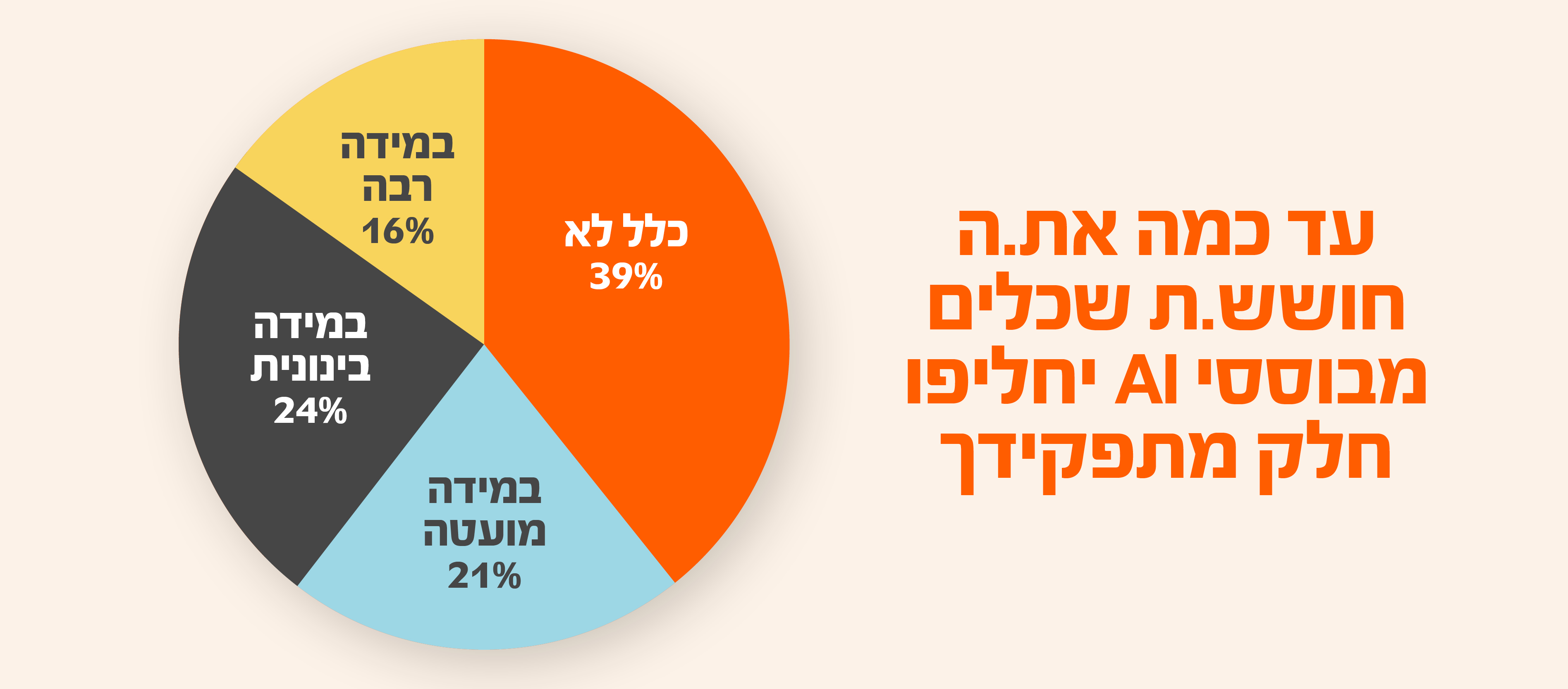במקביל, רוב העובדים שומרים על קור רוח לנוכח השינויים הטכנולוגיים: 40% מהמשיבים ציינו כי אינם חוששים כלל שכלים מבוססי AI יחליפו חלק מתפקידם בעתיד. נתון זה מעיד כי העובדים בישראל מאמינים בכוחם להתפתח ולהישאר רלוונטיים.