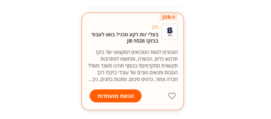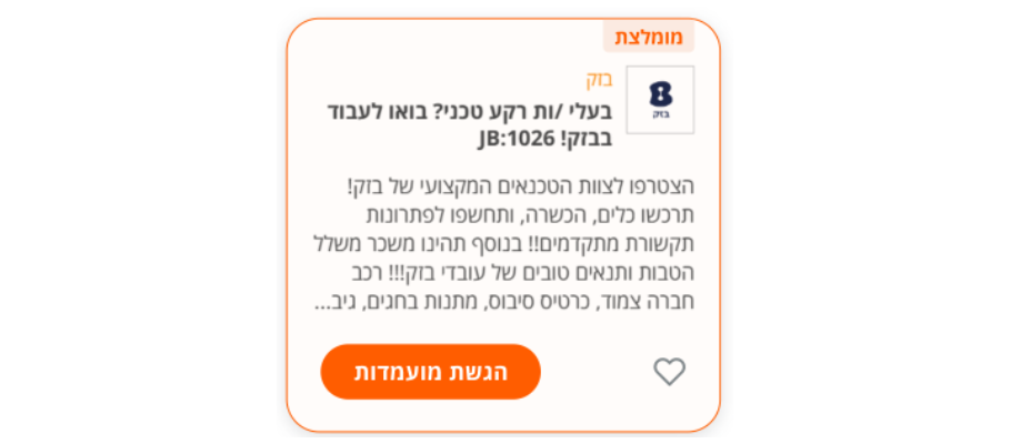 משרת TOP JOB: מופיעה תמיד ראשונה בכל דפי המשרות בתחומים הנבחרים. מבטיחה בולטות גבוהה לאורך כל תקופת הפרסום. מובלטת על ידי לוגו, רקע כתמתם ועל ידי כותרת ומסגרת צבעונית המבליטה אותה משמעותית מיתר המשרות.