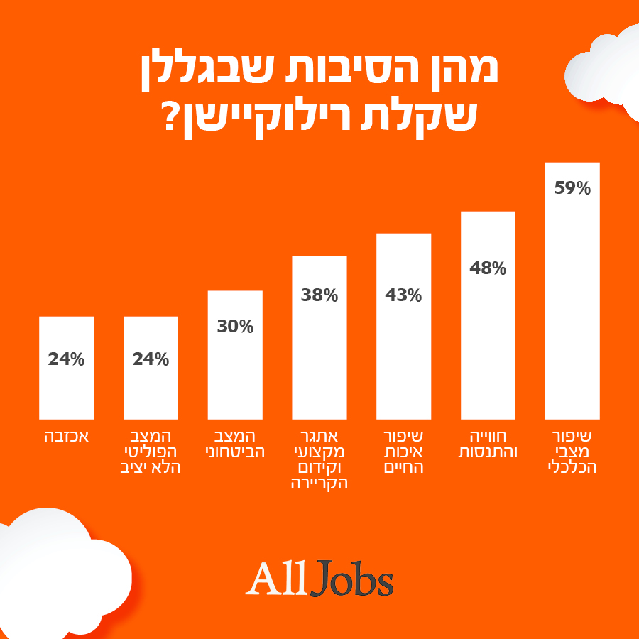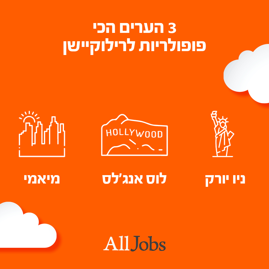 ליאת בן-תורה שושן, סמנכ"לית תחום קריירה והשמה ב-AllJobs, מסבירה: "אנחנו רואים שינוי עמוק בתפיסת העובדים – ממצב שבו רילוקיישן היה בחירה אסטרטגית לקידום מקצועי, למהלך שנובע מצורך רגשי, בטחוני וכלכלי. הימשכות הלחימה, אי הוודאות הפוליטית והמצב הכלכלי מביאים יותר ויותר ישראלים לשקול ברצינות עזיבה. השיקול הכלכלי עדין ממשיך להיות גורם מפתח בהחלטה לעבור לחו"ל – במיוחד על רקע יוקר המחיה, הריביות הגבוהות והשחיקה בהכנסות. לצד זה, רבים מחפשים איכות חיים טובה יותר ואיזון נכון בין חיי משפחה לעבודה – ערכים שהפכו קריטיים במיוחד בשנים האחרונות."