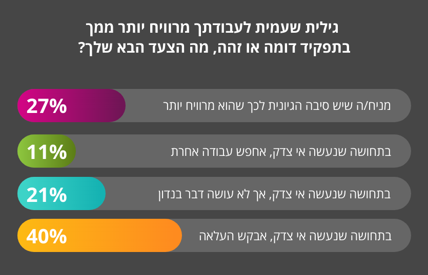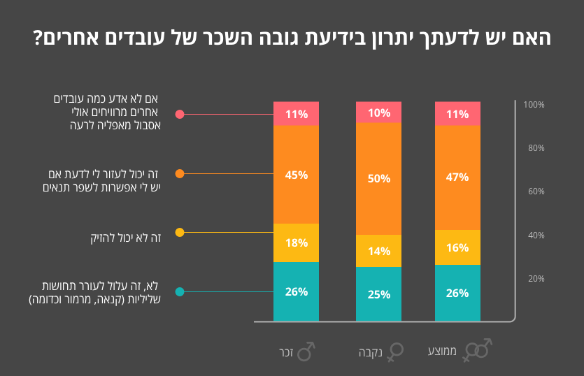 התשובות הפתיעו גם אותנו, ולטובה: 74% השיבו לאחר התלבטות או באופן נחרץ כי לא יציצו בתלוש. רק 27% מהנשאלים הביעו נכונות חלקית או מלאה להציץ בתלוש שכר של עמית לעבודה אשר הושאר ללא השגחה.